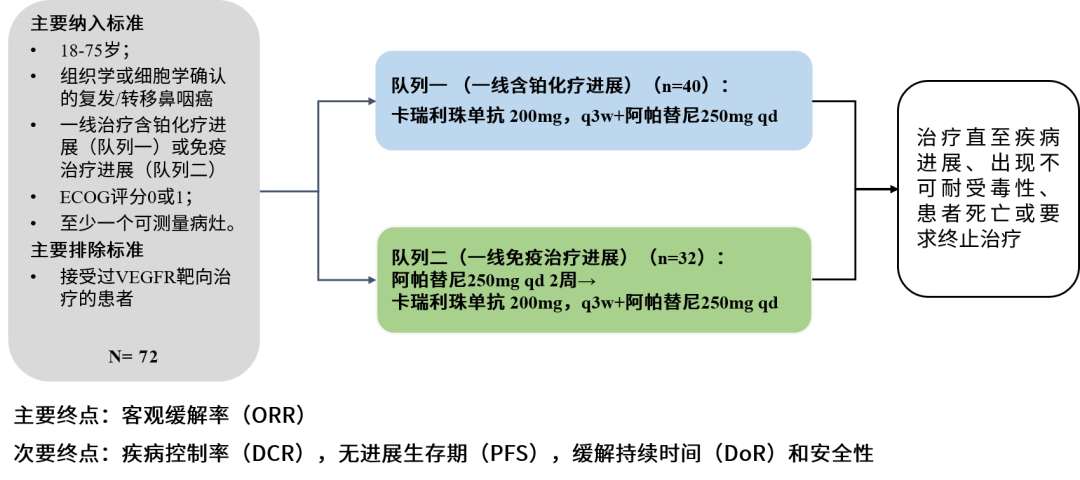 本研究是一项开放标签、双队列、单中心Ⅱ期临床试验。主要入排标准为:18-75岁,组织学或细胞学确认的复发/转移鼻咽癌,不适宜接受局部治疗,ECOG评分0或1,一线接受含铂化疗进展(队列一)或免疫检查点抑制剂联合或不联合含铂化疗治疗后进展(队列二),至少有一个可测量病灶。排除接受过VEGFR靶向治疗的受试者。队列一的患者接受卡瑞利珠单抗200mg每3周一次以及阿帕替尼250mg每天一次,队列二的患者先接受阿帕替尼单药治疗2周来重塑免疫抵抗的微环境,后进行卡瑞利珠单抗联合阿帕替尼治疗,直至疾病进展、出现不可耐受毒性、患者死亡或者患者要求终止。主要终点是客观缓解率(ORR)。次要终点包括疾病控制率(DCR)、无进展生存期(PFS)、缓解持续时间(DoR)和安全性。